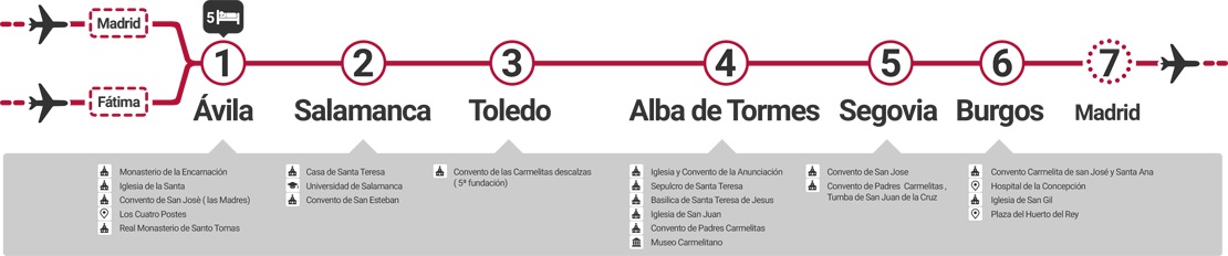 Son 17 los lugares elegidos por La Santa para dejar sus Huellas , viaje que comienza en 1567 y que duraría 20 años recorriendo Ávila, Medina del Campo, Malagón, Valladolid, Toledo, Pastrana, Salamanca, Alba de Tormes, Segovia, Beas de Segura, Sevilla, Caravaca de la Cruz, Villanueva de la Jara, Palencia, Soria, Granada y Burgos.