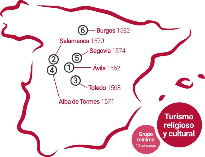 Son 17 los lugares elegidos por La Santa para dejar sus Huellas , viaje que comienza en 1567 y que duraría 20 años recorriendo Ávila, Medina del Campo, Malagón, Valladolid, Toledo, Pastrana, Salamanca, Alba de Tormes, Segovia, Beas de Segura, Sevilla, Caravaca de la Cruz, Villanueva de la Jara, Palencia, Soria, Granada y Burgos.